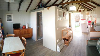 The rest of the chalet is open plan and includes a fitted kitchen with a full sized electric cooker with halogen hob, fridge (with freezing compartment) and microwave. There is hot and cold water throughout.