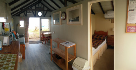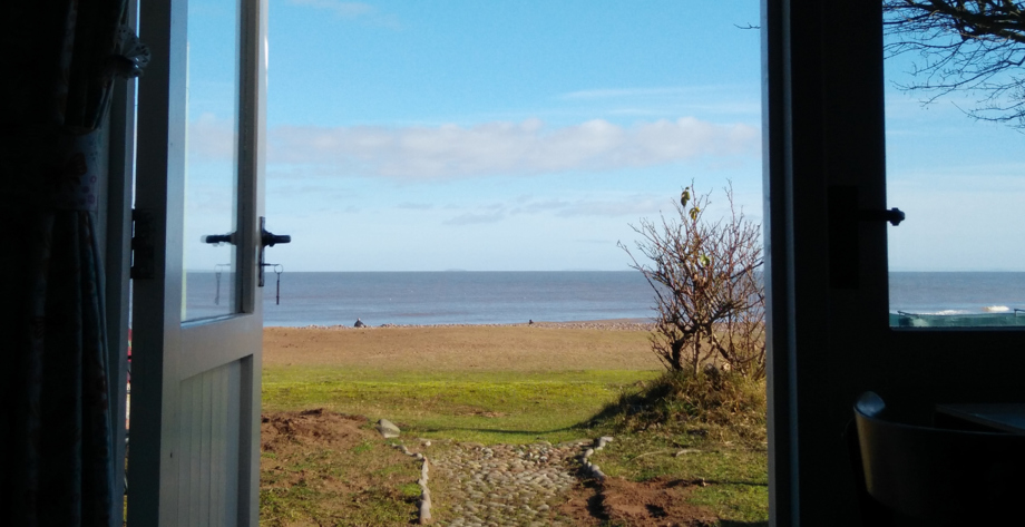 The sitting/dining area has a large three/four seater sofa which opens out into a king size bed or two singles, dining table and chairs, a TV with Freeview and DVD and a panoramic view of Dunster beach, the Quantocks and Somerset coast beyond.