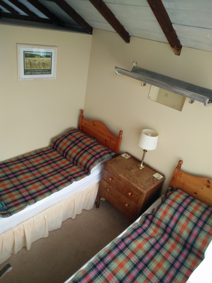 There is a walled off twin bedroom, themed like a railway compartment, with a small chest of drawers, luggage rack for additional storage and boxes under the bed as well as hooks and hangers on the walls for coats etc. The bathroom has toilet, basin and shower and a small storage locker for cleaning materials (supplied).